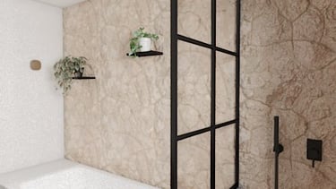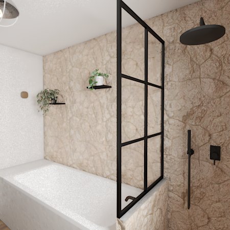 Le muret qui sépare la douche de la baignoire est remplacé par une verrière qui laisse entrer la lumière du jour et agrandit l'espace